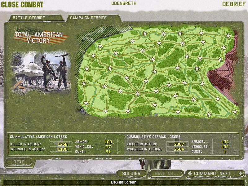 This page describes my experiences in a Close Combat IV Grand Campaign as the US versus the Computer. The settings were 'Veteran' for the AI (to avoid the appearance of 'Wurfrahmen' rocket launchers on patch level 4.02) and 'Hero' for myself. The tactical battles were set to end after all victory locations were taken with no time restraint and no previous warning. In retrospect, I regret not having set a time limit. Although I prefer a slow-paced game, sometimes, especially when I had to counter-attack, the tactical battle took more than an hour to be finished. Also, the 'no warning' setting enabled me to use 'rush the last victory location' tactics on some maps (especially on the 'Echternacht' map, where you can attack the 'to the Reich' victory location from the south and avoid a fight with the remaining enemy troops, see screenshot below). All in all, I cannot believe that I actually finished this thing! The Close Combat 4 Grand Campaign is a truly epic undertaking! It takes literally hundreds of battles to finish it.