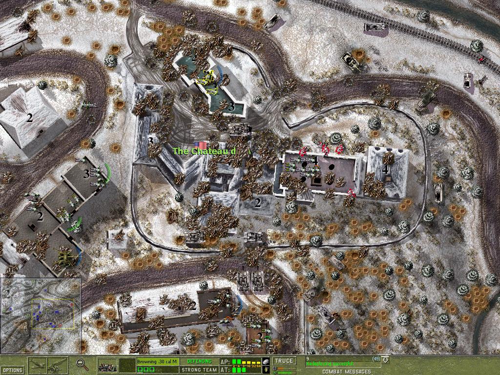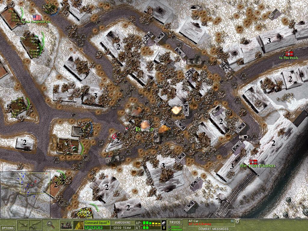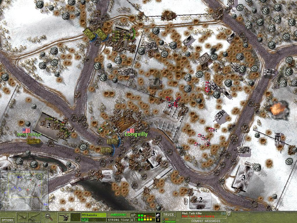The fact that I achieved a total victory at the latest possible moment (afternoon turn of the 31st) does of course satisfy me! Actually the last moves were easier than I anticipated because I disbanded most of the battelgroups on the morning turn and then found the 'critical' German start maps unoccupied on the afternoon turn. I thought that I would find lower quality groups there, but since I destroyed the groups which started there in the morning turn, the maps stayed empty. This is a very good thing because attacking across open ground is a very costly undertaking in Close Combat. This was also true for the Artificial Intelligence, which most of the time took heavy casualties. It has been blamed repeatedly for being 'stupid', but I disagree. The times when I had to counter-attack against an entrenched enemy were always a blood-bath. And the AI was attacking most of the time. So little wonder it took too many casualties. But considering the circumstances the AI does quite well, I think. The fact alone, that the AI leads with infantry teams, caused me considerable concern. I have to admit that most of the time the AI was able to seize the main victory location and I was only able to grab it back because it moved it's troops away towards the next victory location. Had it just stayed and called for a truce, I would not have been able to counter-attack successfully. But since it was slowly attrited on its trip to the next victory location, I could achieve a victory in most cases. The AI is also frequently accused of 'camping'. I have to admit that whenever the AI was camping (especially tanks without infantry support) it did so for a good reason. Of course I begged it to move into my kill zones, but would that have made it a better AI? I do not think so! The only criticism I want to voice is that if the AI does not see a way to advance further, it should offer a truce earlier, not only when it is close to being disbanded. This way it could extend it's deploy zone and bring itself in a better position to counter-attack. Furthermore, the AI was not able to put stand-off fire on ambushing teams. Therefore, the advancing infantry was slowly chewed up, especially since they prefer to crawl or stay pinned in open ground. The human player is obviously more capable of spotting muzzle flashes and put down suppressive area fire. Fortunately. Another option I would like to see is the ability of the AI to remember the player's deployment scheme. Towards the end of the campaign I knew the 'ideal' set-up for most maps and deployed in the same pattern again and again. If the AI had shelled the respective positions as a precaution, the game would have ended differently! This is especially true for buildings, which were the main line of resistance of every defense. I was surprised that I could evacuate teams in buildings under heavy fire. Most of the time at least 50 percent of the soldiers survived. This was especially convenient in the case of bazooka teams. They could be kept alive quite well by making them attack by issuing the 'Defend' order and putting them on 'Ambush' to reload. Generally, preferring 'Defend' over 'Fire' is the recommended approach. The teams intelligence should be trusted! Most of the time they did have a good reason not to fire. And when their self-preserving instinct was overruled by the 'Fire' order, they not seldom perished soon afterwards. Something I learned towards the end of the Campaign was the fact that tanks which are put on 'Ambush' only engage other tanks and actively chamber armor piercing rounds, even replacing chambered high explosive rounds in the process (thanks to Cappy-R for pointing this out). A note on the King Tigers: At German 'Veteran' level I encountered only a few (two? three?) of these things. They are an absolute nightmare! I have never managed anything better than an immobilzation shot against these monsters. Except once, when one of them came close to a machine gun team. It obviously blew the cat up with a satchel charge, after countless tank rounds just bounced off! A note on mortars: they are quite efficient against open topped vehicles! Usually one can achieve one or two kills with the crew-served teams (20 rounds) or even more with the mortar vehicles. On the other hand you have to keep your own vehicles in motion to avoid destruction. Since vehicles and tanks can easily be spotted by everybody (the 'bee-hive' syndrom) they come under fire very soon. Move them out! Do not forget to check frequently that they are not under fire! It is most annoying to find your tank destroyers abandoned just because you focused on another region of the battle-field and did not pay attention to them.