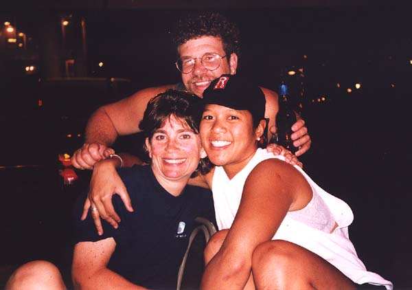 Mary and Janella with Tom taking up space in the background on the deck of the Detroiter