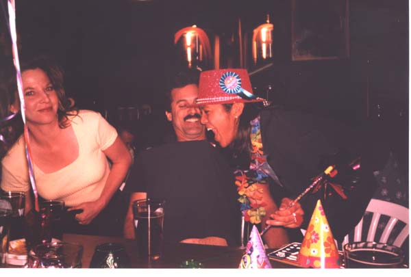 Jim showing off his party hat breast implants while Kathy and Janella check them out.