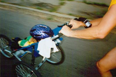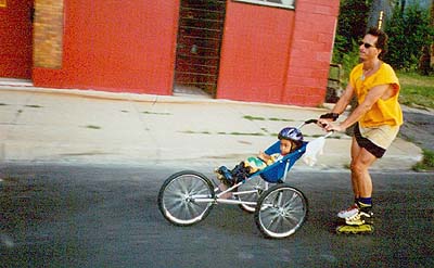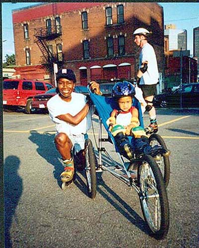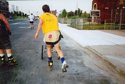 It was just another skate night until a special new skater showed up. Virginia, who had moved to Detroit with her Husband and 2 and a half year old daughter Teresa 3 weeks prior to this skate, read about us in the paper and decide to give it a try. Her husband could not make it so she came alone with Teresa in the stroller ready to skate. That night the group decide to go to grosse pointe, one of the harder longer skates we do. So without any idea of what she was getting into Virginia sets off onto the streets of Detroit pushing her baby. After a few thousand feet it was apparent that she was never going to keep up, so the one and only Cooper took over the baby stroller pushing chore. What a site seeing Cooper in a skirt and one Solomon 5 wheel skate and one low cut quad racing skate pushing a complete strangers baby all the way to Grosse Pointe. On the way back Cooper was getting tired so I got behind and pushed them up a long bridge. It was so fun to do this that on the final 2 mile run home on Larnard I got behind and pushed them to the front of the pack and before long we were leading the skate while Teresa was laughing and cooing about the lights of the Ren Center, totally oblivious to the speeds we were reaching. When Virginia finally got up to us back at the Detroiter she was thanking us for the help and saying what a great time she had. When I got home that night and reflected back on what Cooper and I did I started realizing how crazy that was to do. It seemed so safe in the moment, but what if we had gone down at those speeds, who knows what would have happened, especially with Cooper on a stone and stick catching quad skate. I appreciate Coopers skating skills more now after that experience. Virginia must have had the same realization to the safety issues of what she did because they have yet to come back.