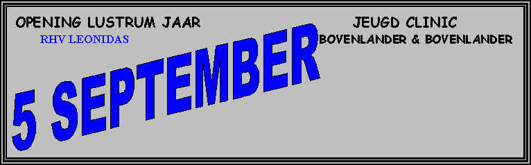 & Bovenlander Jeugd Clinic Op zaterdag 5 september a.s. komt Floris Jan Bovenlander samen met zijn broer Jeroen weer naar onze hockeyvereniging. Floris Jan gaat met enkele toppers uit de Nederlandse hockeywereld de jeugdleden van Leonidas trakteren op een clinic met o.a. een weergaloze hockeydemonstratie, een training in circuitvorm waarop de laatste trucs op hockeygebeid worden onderwezen. Tot slot worden er wedstrijdjes gehouden met de top-trainers. Misschien komt zelfs de snelheidsmeter mee zodat de jeugdleden kunnen gaan strijden om wie er het hardst kan slaan op Leonidas. Floris Jan Bovenlander werd 6 maal landskampioen met HC Bloemendaal, droeg bijna 250 keer het oranje shirt van het Nationale Elftal, veroverde in 1987 het Europese- en in 1990 het Wereld Kampioenschap. Het hoogtepunt uit zijn carričre was het behalen van de gouden Olympische medaille in Atlanta in 1996. Hij zal s-avonds tevens meespelen in de wedstrijd tegen Heren I |