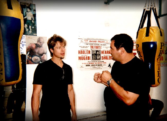 On Monday 6th September the Hollywood Actor Brad Pitt flew into Britain and visited Callowland Boxing Club for rehearsals on his newest film. The young actor is to portray the role of an Irish bare-knuckled fighter and should become a regular visitor to Callowland during filming. The provisionally named 'Diamonds', a big budgeted underworld thriller is based upon a tough Irish gipsy called One Punch Mickey. After hearing off Callowlands fine reputation for training individuals who wish to learn this noble art Brad contacted the club to gain lessons and a further insight into the world of boxing. During filming Brad will be a regular visitor to both Callowland Boxing Club and Jct 5.