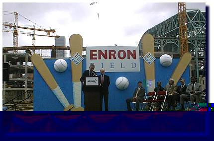 HOUSTON - Even though the Astros didn't make the Playoffs, they are still confident in next year. The only player lost due to free agency will be Brian Keyser who apparently asked for more money than Houston was willing to pay for him and he stormed out of the office in a bitter rage.The Houston Astros are very excited about the new baseball park coming in next season. It is called Enron Field. It will be an outdoor stadium with plenty of concession stands and restrooms for all. The name of the field comes from Enron Energy Services, which is an electric company.
