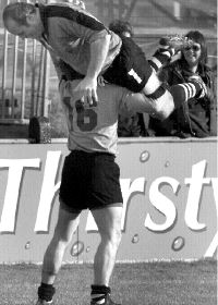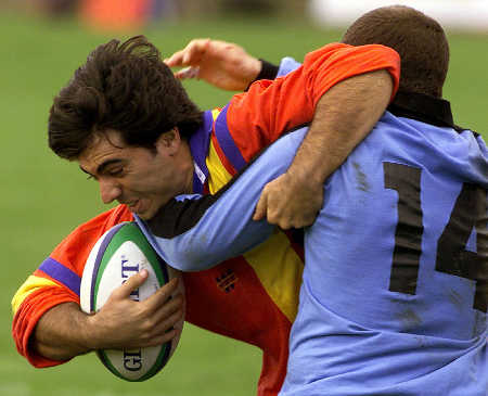 Juan Menchaca levantando a Rodrigo Sánchez tras haber convertido el try que le aseguró la victoria a Uruguay frente a España
