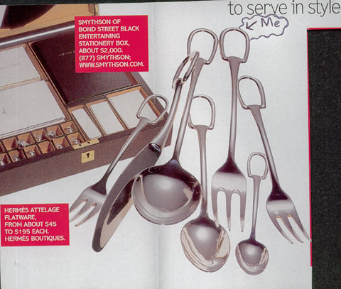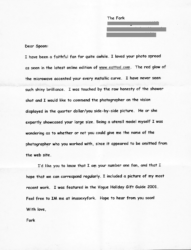 The Spoon received a letter today from a utensil identifying them self as"The fork" (pictured right). The letter in it full text is located here [forks address has been blanked out for privacy reasons]. The fork was recently featured in the Vogue Holiday Gift Guide 2001 with a retail value of "from about $45 to $195 Each" thanks to Hermes Boutiques, Pretty impressive if you ask me. The spoon was overjoyed when he received mail and started to taunt me that he gets mail than I [which is now true]. Oh yeah...fork...if your reading this...spoon told me to tell you that he said "hi" and that he would be writing back to you soon. |