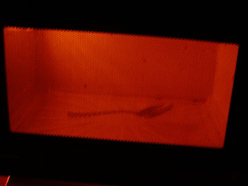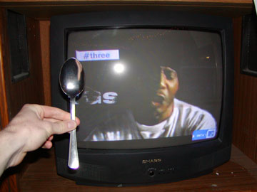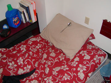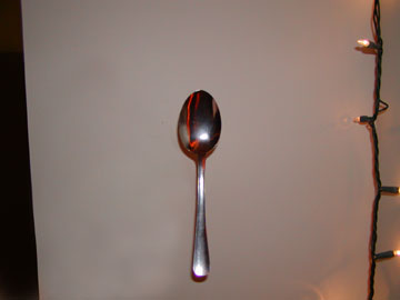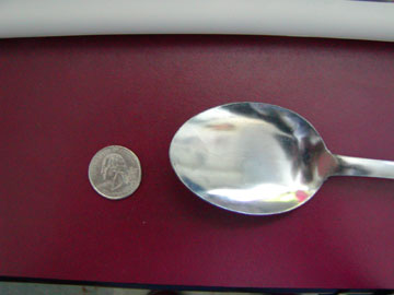 An extremely large spoon was found in the cafeteria the other day. I mean this thing is big (see picture to right) I used this spoon to eat a bowl of crispix, it was a moderately large bowl of cereal and it still only took 3 bites to completely relieve the bowl of its contents. Here for your own comparison is the spoon placed next to a US quarter dollar. The spoon is nearly the size of stephen's bed and is heard to get as many girls as stephen also. When placed into the microwave the spoon sparked and a funny smell filled the room. The most peculiar property of this spoon might be the ability of the spoon, when a picture of it is taken in the mirror, with a flash photo, a strange ray of light is emitted ...go figure. If you would like to get in contact with the spoon you can write a letter to it @ this address::