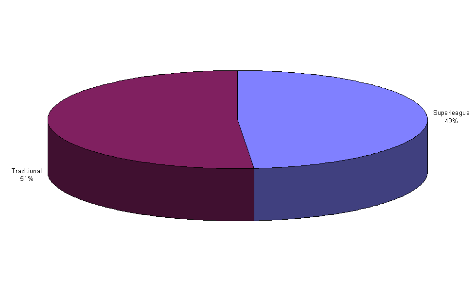 The survey respondents leaned towards the traditional confrontation by a meagre 1 %. Due to the fact 98 % of the respondents were under 40 years of age, this shows that younger respondents are rather evenly split between a traditional confrontation and a "Superleague" style game as their preference.
