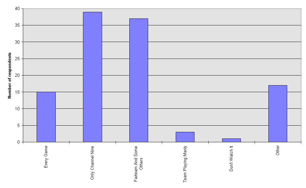 Nearly two thirds of respondents have Foxtel or Optus Vision. This percentage would have been far lower a couple of years ago during the off field bickering, and highlights the influence that Pay TV has had on the broadcasting of the game in a short space of time. The 36 % who do not have access to Pay TV may be disadvantaged in keeping in touch with the game and may be less likely to follow the game if their team were to fold or merge.
