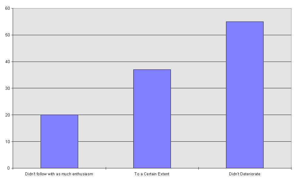 The interest of over half of the respondents did deteriorate in some way when there were two competitions in 1997, although "Didn’t Deteriorate" resulted in a higher percentage than the other two alternatives. Does this mean that the game will lose more interest in 1999 and 2000 if it cannot settle on a consistent format (meaning the number of teams in the competition not continually altering).