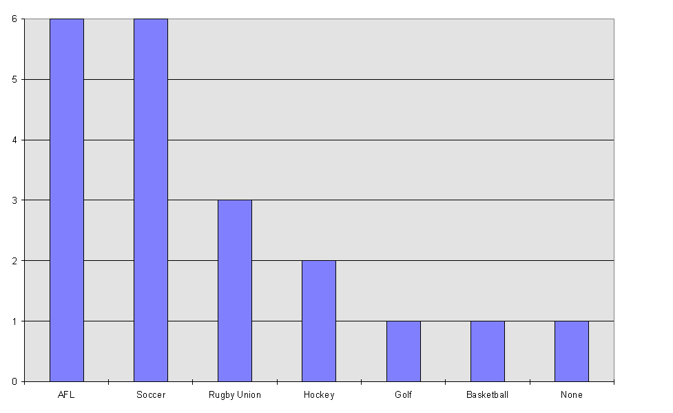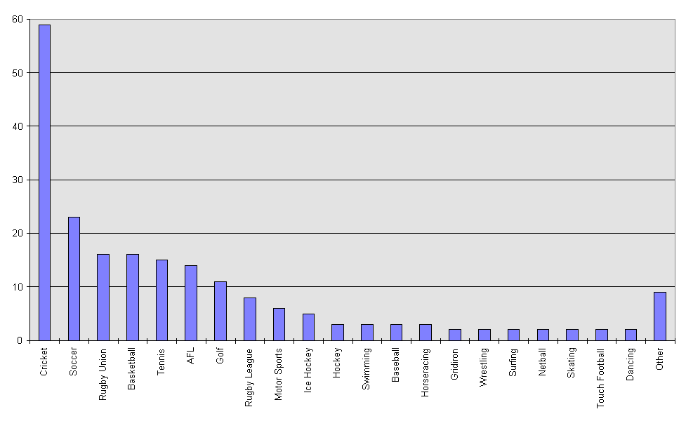 Cricket was easily the most popular other sport, highlighting the fact that most of the survey respondents preferred league as their favourite winter sport, and showing that few league fans also like AFL. Looking at the results of the 115 surveyed respondents, AFL would seem to not be such a strong competitor to league as it is only the sixth popular other sport. But if the Sydney Swans continue to do well and if the NRL upsets its fans with undesirable mergers, AFL may attract ex-league fans.