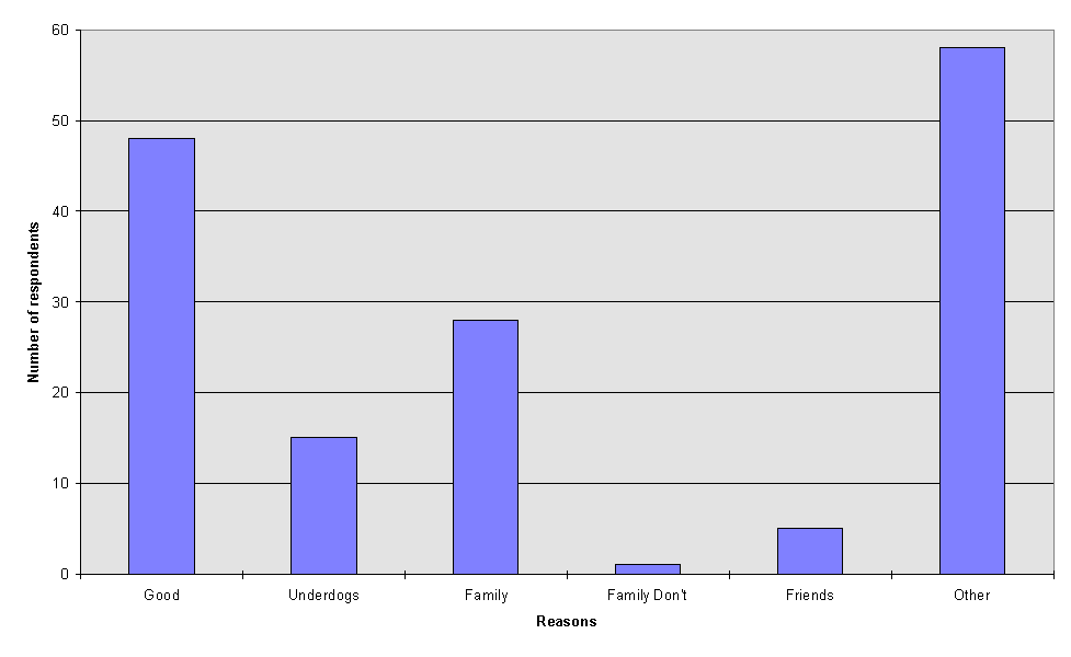 Most survey respondents had strong reasons for supporting their team with Other and Good the most popular reasons. Less strong reasons i.e.: Family Don’t and Friends were unpopular and this seems to reflect the seriousness of the respondents who all feel as if the issues are highly relevant to them.