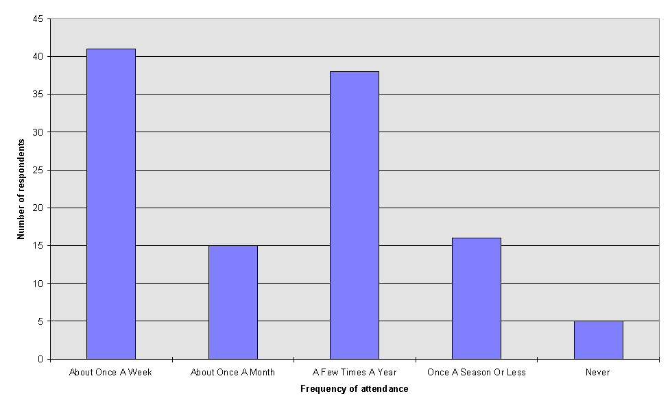 This is a further reflection of the surveyed respondents. Without doubt many of them are diehard football fans as 41 respondents attending games weekly clearly shows. But there are still over 10 % of respondents who attend games very rarely. Crowds have been down over the past few seasons, which is one of the reasons why rationalisation must occur.