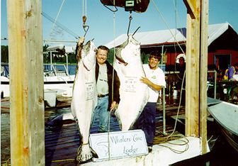 | Here's my dad and I in Alaska after a day of fishing...these are Halibut's... pretty mid sized ones too... Dad pulled his up first and was pretty happy till I landed this beast...His was 108 lbs. and mine was 169 lbs. we were at Whaler's Cove Lodge on Killisnoo Island, off Admirality Island and the town of Angoon... any way I started a pool at the begining of the trip (cause I caught the biggest salmon of the week last year and my dad was too cheap to enter me so I didn't win) and I won about 220 bucks! because I caught the biggest Halibut of any one in the pool!... I was pretty happy...oh and we had to shoot these with shot guns 'casue they would not die and could flip us out fo the boat with a flick of thier tails...it was a cool day. | ||||||||