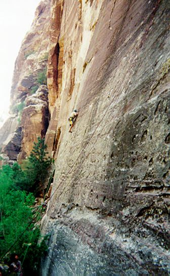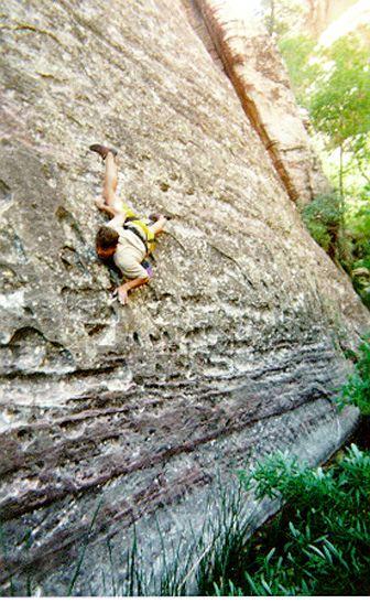 | Here I am on a 5.9 at Dark Shadows. This climb is amazing. One of our leaders, richard, had to lead it so we could top-rope. The first few moves, besides the crux, were probably the hardest on the c