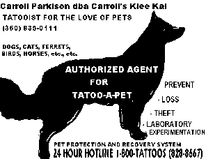 It is a plus that it is illegal for any lab to perform testing on an animal which has been tattooed and Animal Shelters will contact Tatoo-A-Pet. For these reasons, I have begun tattooing all dogs before they leave my property. Therefore, please be sure to add the price of the tatooing and lifetime registration which is $20.00 to any price quoted for any Klee Kai being adopted. This will also protect the new owners while the dog or pup is in transit to his/her new home because my tattoo is instantly recognizable to the registry. They will know I did the tattoo and that it came from the Washington area.