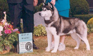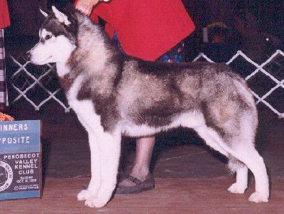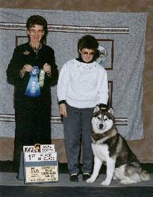 Sinbad received the first leg of his CD on Saturday, February 17, 2001 at the Connecticut Valley Siberian Husky Club specialty, going 1st in the Novice B class!