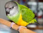 I'm a 9 inch long Senegal parrot and probably the most readily available of the genus poicephalus, and I'm instantly recognizable with my charcoal-gray head, black beak and yellow-to-orange chest marked with a distinctive green V. My olive-green wings sport yellow "epaulets" at the bend. I'm an adult, so my eyes are yellow-gold; baby Senegals have grey eyes.