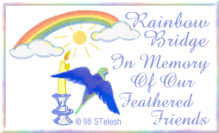 I questioned this decision only once but knew it was the right one for you. I cry only for myself because I miss you so badly, but I know you are much better off now. I held you in my arms as you went to sleep for the final time. You deserved the comfort of me holding you as we said goodbye to each other. It was so hard, Speedy, but you are no longer uncomfortable, and I know you finally fly free.... unfettered by your sore body. You are with our very special guardian friends Woodro and Aron, and I know you will all take care of each other now till we meet you across the Bridge.
