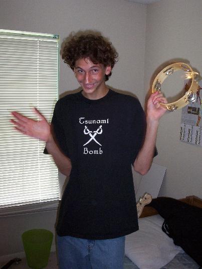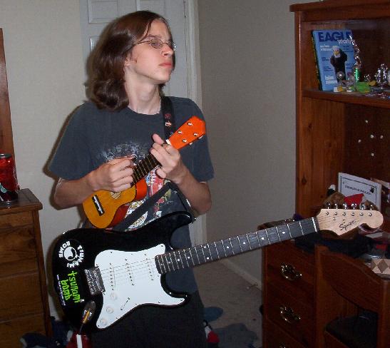 Simon with his ukulele and Zach's guitar. Switching between them is not easy.