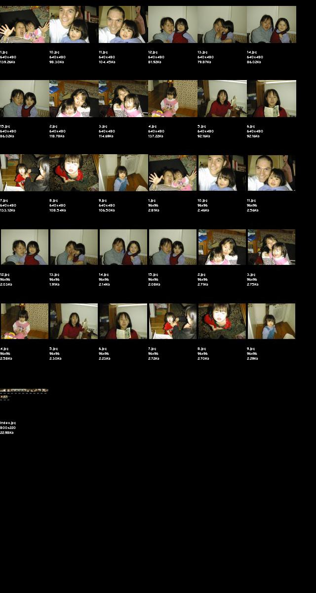 Look at the index.jpg for a picture with all the thumbnails in case your connection makes popping through each 250k picture labourious. The filename is listed under each thumbnail in the index.jpg so you'll have to go back to the directory and click on the full image you'd like to view manually for now. Sorry, when I get thumbnail generation working you'll get the display of the thumbnail and just click to get the big image again. The naming convention for files and directories is Month-Day-Year for now. Now back to law school...