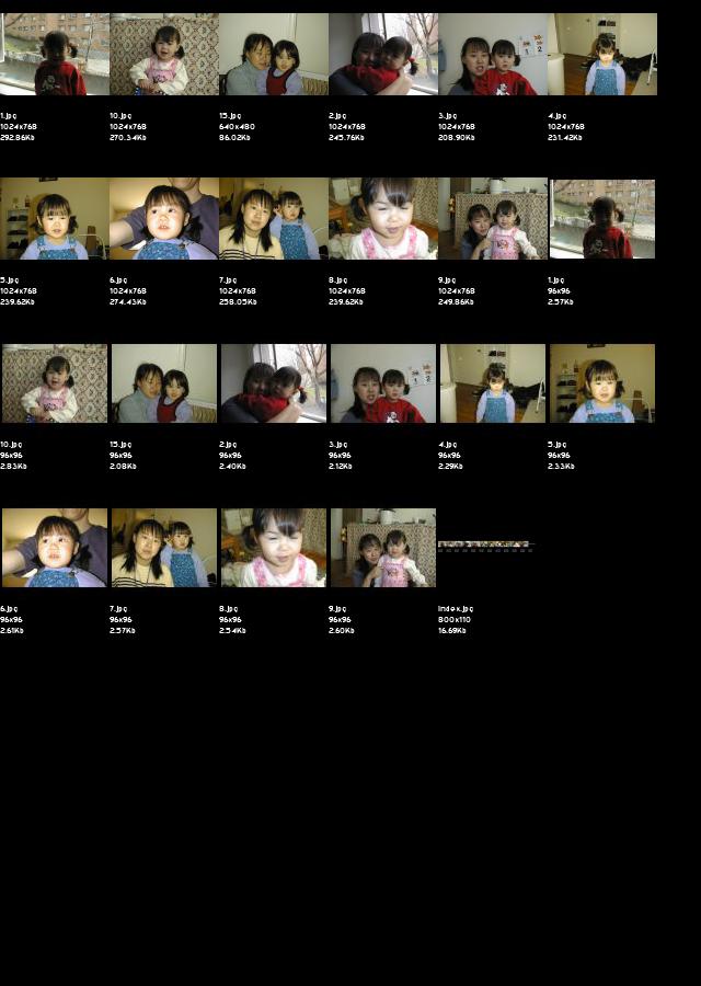 Look at the index.jpg for a picture with all the thumbnails in case your connection makes popping through each 250k picture labourious. The filename is listed under each thumbnail in the index.jpg so you'll have to go back to the directory and click on the full image you'd like to view manually for now. Sorry, when I get thumbnail generation working you'll get the display of the thumbnail and just click to get the big image again. The naming convention for files and directories is Month-Day-Year for now. Now back to law school...