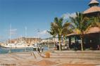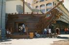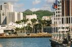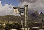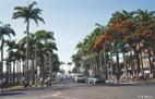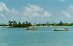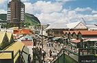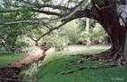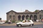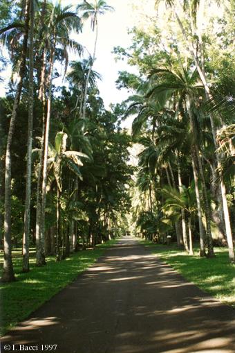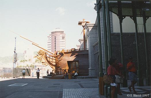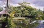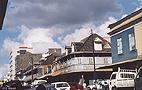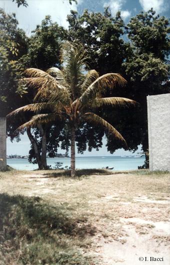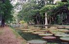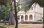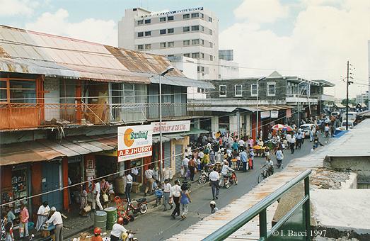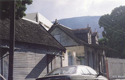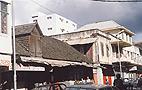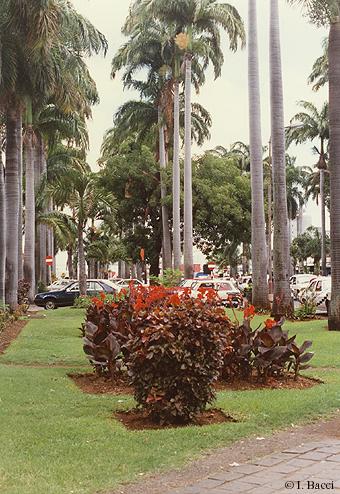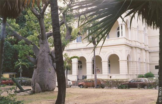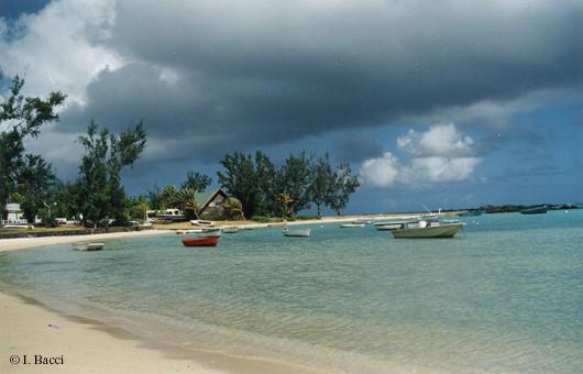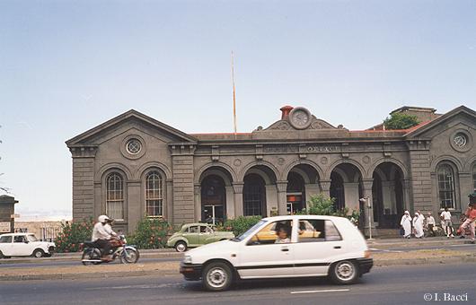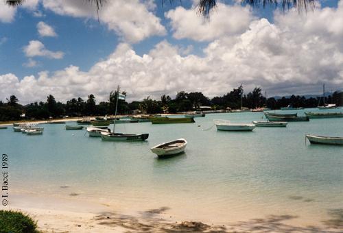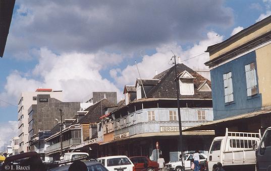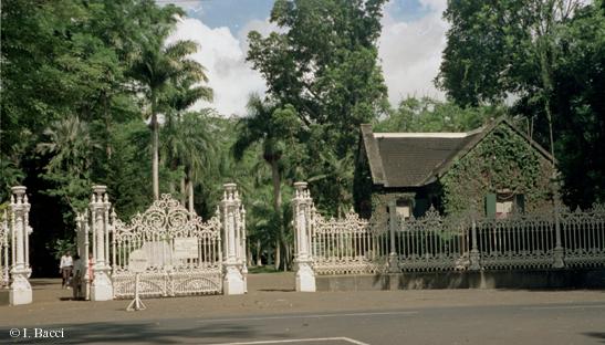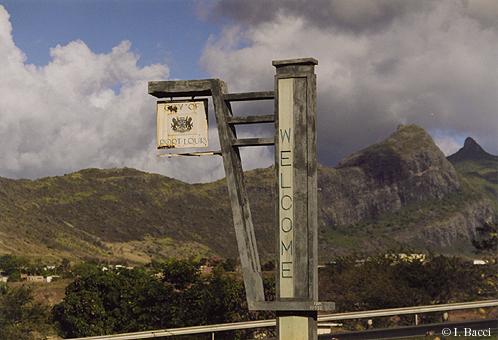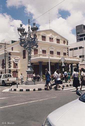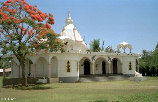 Au fond, en rose et blanc, le temple de Grand-Baie