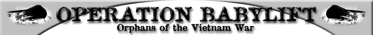 May 1, 2000 - Welcome to my site. Currently everything is not up and running. However so far I have been able to add most of the content I was planning too. I hope you enjoy it. I also hope that the Operation BabyLift reunion was a huge success this weekend. I only wish I could have attended. Perhaps I'll make it to the one in Colorado this summer. Who knows. As soon I know specific dates for any more reunions I will be sure to post them! Please e-mail me if you have any information. May 2, 2000 - Reunion Information!!! June 29,30 and July 1 in Estes Park Colorado by Rocky Mountain National Park. Contact Sister Mary Nelle Gage for more info at 303-985-2854. May 7, 2000 - I am sorry if I have not responded to any of your e-mails. It's been hectic for me due to problems with DSL using Pacbell. So this weekend I had to go to work and update my web site. I hope you like the changes. Also check out the reunion page! I actually wasn't planning on going until I decided I might do a little documentary on this. Is that a good idea? Place your opinions in the Forum! May 15, 2000 - My DSL is still down but I thought this was important. From what I have been told about the reunion on Colorado there are plenty of rooms now! Simply send in $100 deposit along with the registration. These are mountain lodges, where people bunk together and they can accommodate everyone. There are also motels nearby, and I'll be checking on those soon. No one will be turned away--everyone can come. Check out the Reunion section for more info! |