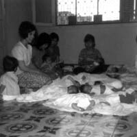An epidemic of measles ravaged the Friends of Children of Viet Nam Nursery in October and November of 1974, claiming the lives of forty of our babies, one-third of our nursery. The psychological impact of this loss was severe for our Vietnamese and American staff, yet we knew, that in spite of this tragic loss, our babies faced a better chance of survival in our center than in the orphanages where the infant mortality rate was often as high as eighty per cent. If our initial struggle for life was won, the infant would be placed in the care of one of our Vietnamese foster mothers, thus isolating the baby from massive exposure to communicable diseases, which was ever present in our nursery. A referral photo and information sheet was prepared for each infant and sent to our agency in the United States. The information transmitted presented the infant by "nursery name", approximate age, general health, racial background, sex, and included any information pertinent to the infant. The infant was then offered to a family approved by our agency. When the family accepted the infant, the family's dossier was forwarded to the staff in Viet Nam. During the interim, the Delta Orphanages would give us birth certificates they had secured for groups of infants that they had entrusted to our custody. The method used co obtain these birth certificates was for the orphanage to randomly select names for a group of infants who were born at approximately the same time; in some instances, fictitious mothers' names were also furnished. This information was then filed with the Provincial Court by the orphanages and after varying lengths of time certificates would be issued. Me would then bring these birth certificates to our office in Saigon.