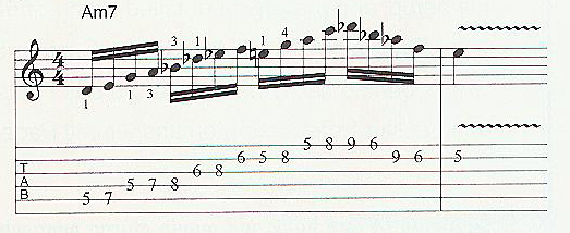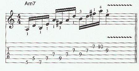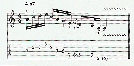 ใน Am7 ปรกติเราจะใช้ A Minor pentatonic ในการเล่น ดังตัวอย่างข้างล่างนี้