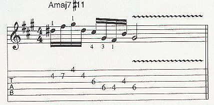 เราสามารถใช้แนวความคิดเดียวกันนี้กับการเล่นในคอร์ดที่เป็น major ได้เช่นกัน ตัวอย่างข้างล่างนี้ ในคอร์ด Amaj7 เราสามารถเล่น Minor pentatonic scale ที่ต่ำกว่า root ของคอร์ดนั้นครึ่งเสียงซึ่งก็คือ เล่น G# Minor pentatonic scale ลงบน Amaj7 นั่นเอง ซึ่งเราจะได้เสียง D# ซึ่งเป็นเสียง #4 ของ A Major scale เพิ่มขึ้นมา ซึ่งก็เปรียบเสมือนกับการเล่น A Lydian Mode นั่นเอง ซึ่งจากแนวความคิดนี้ จะเห็นได้ว่า เราสามารถเล่น A Lydian Mode ได้โดยที่ไม่ต้องรู้จักว่ามันคืออะไรเลยด้วยซ้ำไป