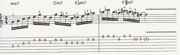นอกจากนี้ ในการเล่นใน Am7 อันเดิมนั้น เราอาจจะเล่น A Minor pentatonic แล้วเลื่อนหนีออกไปให้สูงขึ้นครึ่งเสียง เป็น Bb minor pentatonic ชั่วคราว แล้วขยับกลับมาเป็น A Minor pentatonic อีกที เราก็จะได้เสียงที่ outside กว่าเดิมอีก ดังตัวอย่างนี้