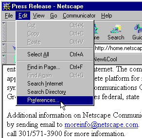 This will show how to configure Netscape Communicator's Preferences. From the menu bar of Communicator, select Edit, then Preferences as shown here. If you want a brief explanation of the current preference, click the X at the top right of any window, at anytime. A small window will appear with brief instructions. Anytime you want instructions, select the X. Then, at anytime, click the top right X of that window to close it. It will close itself after 20 seconds.