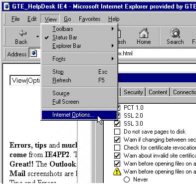 To go through the Options and to set up IE4 as you want it, go to View in the menu and select Options, as it's done here.