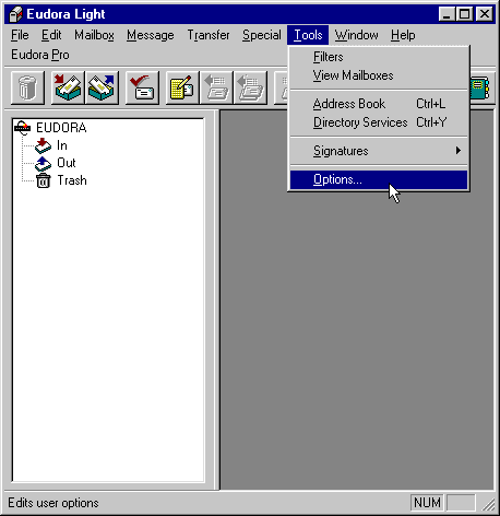 The first step in configuring Eudora Light is to open Euora. Then, go to Tools and click there. From the drop down menu select