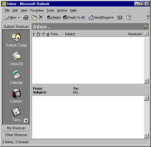 Outlook 2000When you first open Outlook 2000, it will look similiar to this. To go through the menus, click each selection on the menu bar. Click Send/Receive for sending and receiving email. Click New to create a new email to be sent. NEW!...Outlook 2000 Corporate Edition screenshots. Click here |