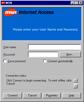 Welcome to MSN IA, after double clicking on the red circle with white msn letters, you're going to see this screen. If you want to change an access number click on properties. The "save password" is to save the password. And of course "connect automatically" starts dialing as soon as you open MSN. The new button (if I remember correctly) is to reset the password.