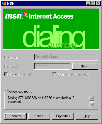 Connect to MSNThis is the dialer that connects you to MSN. On your computer, click Connect and you will be connected to MSN. For troubleshooting purposes, click Properties in the screenshot on the left. Click the Close Box (X) or Cancel to see a replication of a desktop view after MSN has been installed. This will also enable you to see the MSN menu from the taskbar just as you would while using Windows 95/98. Note: After installing the MSN software for a new or existing customer, the dialer is automatically brought up if the user chooses to connect to MSN immediately after signup.