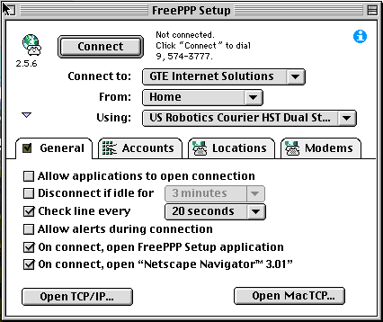 FreePPP Setup will be where you do a lot of MAC troubleshooting. Just run through the configuration here, compare it to your setup, and see where you may be setup wrong. On this particular window, General, it will be basically as it is here, with your preferences, modem name, etc. Press Connect when you want to go online. Click the tabs in the center to check your configuration. Also, the GTE Internet Solutions Access Number will be listed at the top in small letters. To go through the different windows, just click on what you want to see. When the arrow turns to a hand icon, you can select there. Also, at the bottom is TCP/IP and MacTCP. Only one of these will be present, not both as shown here. But they are here to allow you to see the screenshots for both.