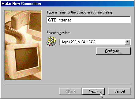 This procedure is the same as Windows95 but the graphics have changed so I included it because of that. Put in a name for the connection, such as GTE Internetworking and choose the modem. Normally, the modem will be listed and you don't have to choose. Then, click Next.