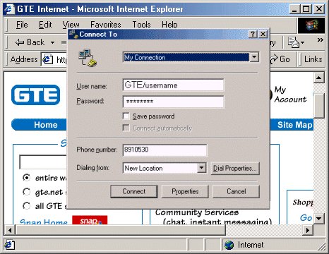 Windows MeThis screenshot is a simulation of the Connect To window or form. To connect with your modem, configure this location on your own computer as illustrated here, using your own personal information. Your setup may be completely different than the screenshot. If you don't know, ask your ISP. Dial Properties, Connect, Properties, Cancel and the Close Box (X) buttons are selectable in the screenshot. This allows you to see how this connectoid is configured.