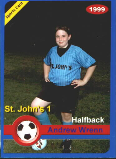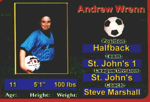 Welcome to my page. My name is Andrew Wrenn, but everyone calls me Andy. I am 11 years old and a 6th grader at St. John the Evangelist Roman Catholic School in Clinton MD. I play the trumpet in our school band and I play on my class soccer team. Here is my Soccer Card. The other side of my sports card I went to Nova Scotia, Canada this summer with my Dad and Grand Parents to attend the first International Gathering of the Scottish Clan Wallace, of which I am a member. My Web Page is about Pokemon. My little brother Jeremy also has a page on this site, be sure to visit before you go.