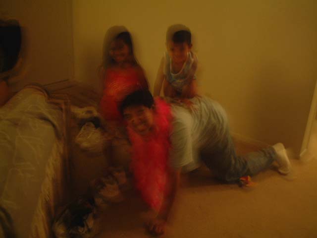 The pic came out fuzzy because I had the flash turned off but it was so cute I had to include it here anyways. Zion is riding my back as Xala guides me around the room.