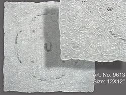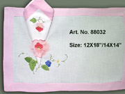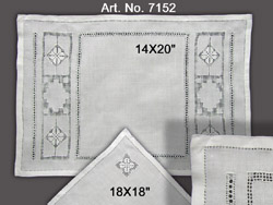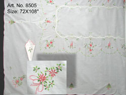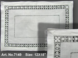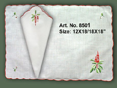 Art. No. 8503 Art. No. 8504 White polyester/cotton machine embroidery breakfast set , each doz. set consist of 12 pcs. placemat in size 12X18 and 12 pcs napkins in size 18X18" Size: 12X18"/18X18". |