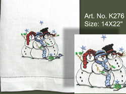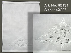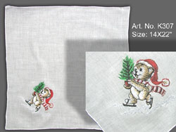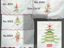 Art. No. 8503 Art. No. 8504 White polyester/cotton with color machine embroidery Christmas design guest towels Size: 12X18" |