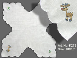 new Christmas Designs fine cotton handkerchiefs have just been included The same Christmas Designs hot roll covers, breakfast sets, placemats and napkins will be included within these few days. |