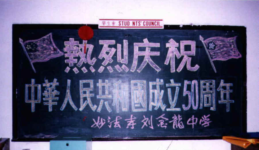 During the National Day ,our Great painter--(a minor staff in my school as I have forgot his name^^) had decorated the Student Council 's blackboard with a strong atmosphere of the National Day. We all love it@@
