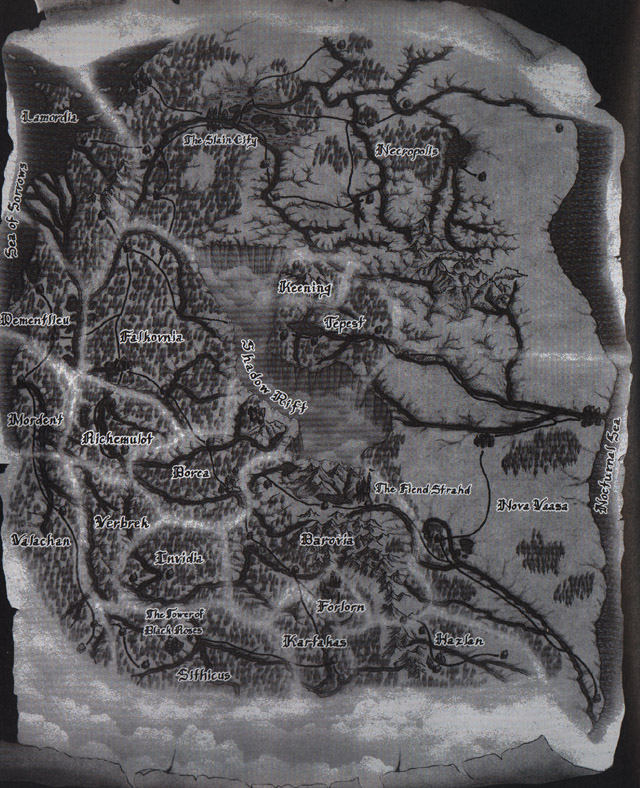 Introduction Your characters travel along a road covered with the growth of non-use. It seems that this adventure will be anything but eventful. Ghosts and creatures of the night indeed! Perhaps the townsfolk who commissioned your band of adventurers are more in need of a night-light and nursemaid than eager soldiers of fortune. For some strange reason, travelers won't use this more direct route through "The Tanglewood" to the neighboring community. Tales of visitors not emerging from the other side seem somewhat overrated. A band of thieves to be disciplined no doubt. The fog appears to be thickening as you proceed. It has a surreal texture and view to it. The mist swirls with the wind. But wait a second....there is no wind! The swirling mist seems to take on various shapes. Was that a lost love? Perhaps you see a long forgotten friend or parent. Now the mist is all you can see. The swirling shapes take on a completely different shape. Forgotten stories from your childhood come to life in the mist. For an instant...was that a Vampire? No...It's a Skeleton! Wait...gone... Now it's becomiong a Ghost! The horses are uneasy beneath you, becoming increasingly difficult to control. The mist begins to clear, but the woods have thinned and the tangled road has disappeared! A river emerges from the mist in front of you. It appears too deep to cross and no bridge is in sight. Suddenly you hear the sound of a craft being poled in the water. A lone robed figure in an ancient ferry approaches. He docks the craft directly in front of you. Strangely, you each feel a weight in your hand. A coin with markings unknown to you has appeared in your hands. The pilot slowly walks to the edge of his boat and extends a skeletal hand... General Rules and Suggestions I will be using the AD&D first edition rules and Ravenloft Campaign rules (especially the rules on fear and horror checks). Any classes, alignments, races, or spells that are endorsed by TSR are allowed. I may introduce other spells, but at some point during the game, these will be accessible to the players (note, however, not all of these may be usable by the players because of race, class, etc. restrictions). The only condition that I am introducing is that I must be supplied a copy of the race, class, spell, etc. (preferably in electronic format) if I don't already have it. Players are allowed, if not encouraged, to feel free to look up monsters by whatever means they have available. The Monstrous Compendium, Monster Manuals, etc. are excellent resources, but these are to be used only as an outline. All monsters are not equal. I have made some adjustments to the existing creatures, but the basics remain the same. Finding new creatures that I have introduced on the internet is fair game. I see this as your characters doing research while "in town". Don't expect the dungeon floors to be littered with magical items. On the upside, don't expect mundane magic (i.e. +1 sword). Magical items will tend to have a specific use and history. Swords will most likely have a name and specific purpose for which they were created. I would like for a player to keep an electronic journal of the sessions. I could post them to the web sight so that players who missed a session could keep up and I feel it would be entertaining for all of us. This isn't required, but I think it would be nice. Review or reread The Lord of the Rings, The Hobbit, and The Books of Lost Swords. This information will prove extremely helpful (hint, hint...). Even watching the animated movies would work. Reading the various "Van Richten's Guide to....." accessories (TSR) would give some insight to the possibilities that I might introduce in monsters. This could also give hints as to possibilities that might exist when looking for a means of defeating a creature. I won't require, but do reccommend, a non-evil party. Due to the corrupting nature of Ravenloft, evil characters are easily controlled by the Darklords. The struggle of Good vs. Evil is the overall theme of the campaign. Downloadable Maps or The World as You Know It....so far (hee, hee, hee) Middle Earth Thror's Map The Shire Ravenloft Nightmare Lands The Journals The Art Gallery Utilities Nosferatu Font Treasure Scribe Campaign Cartographer Demo Wilderness Mapper Quick Treasure Role Player Assistant Dice Roller Spell Scribe Monster Scribe Spellbook Manager Tavern Maker Realms of Interest