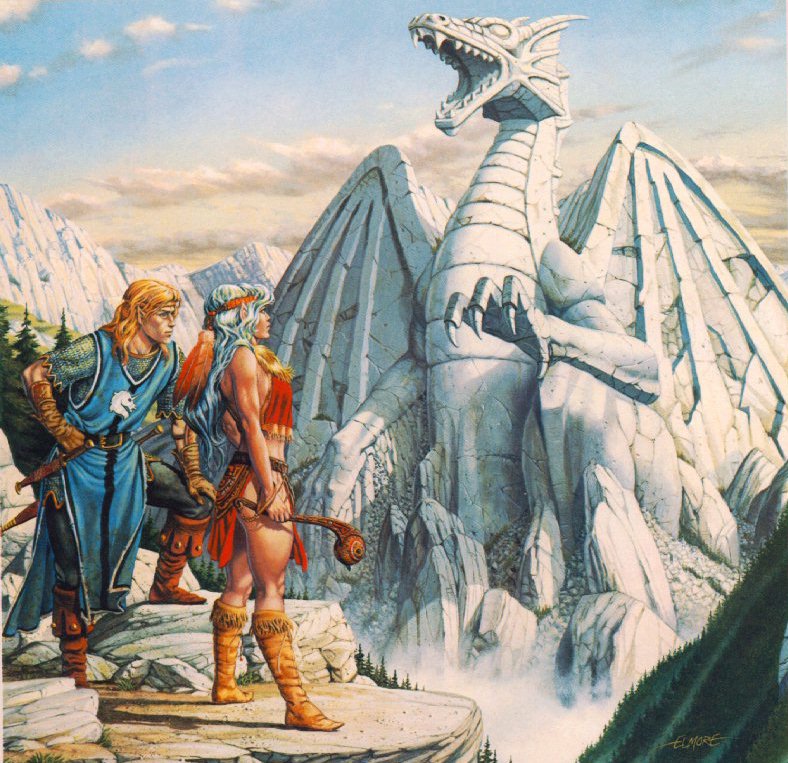 | Silvara and Gilthanas standing in front of staty of The Dragon, outside the tomb of Huma | |