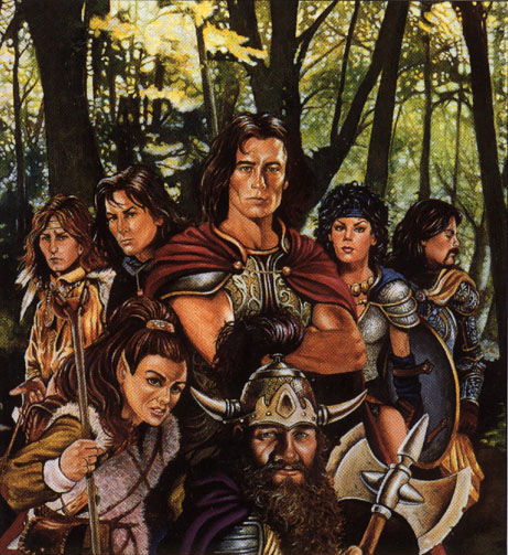 The Inn of The Last Home. By the Sign stands, from the right, Flint, Tika, Caramon and Tas |